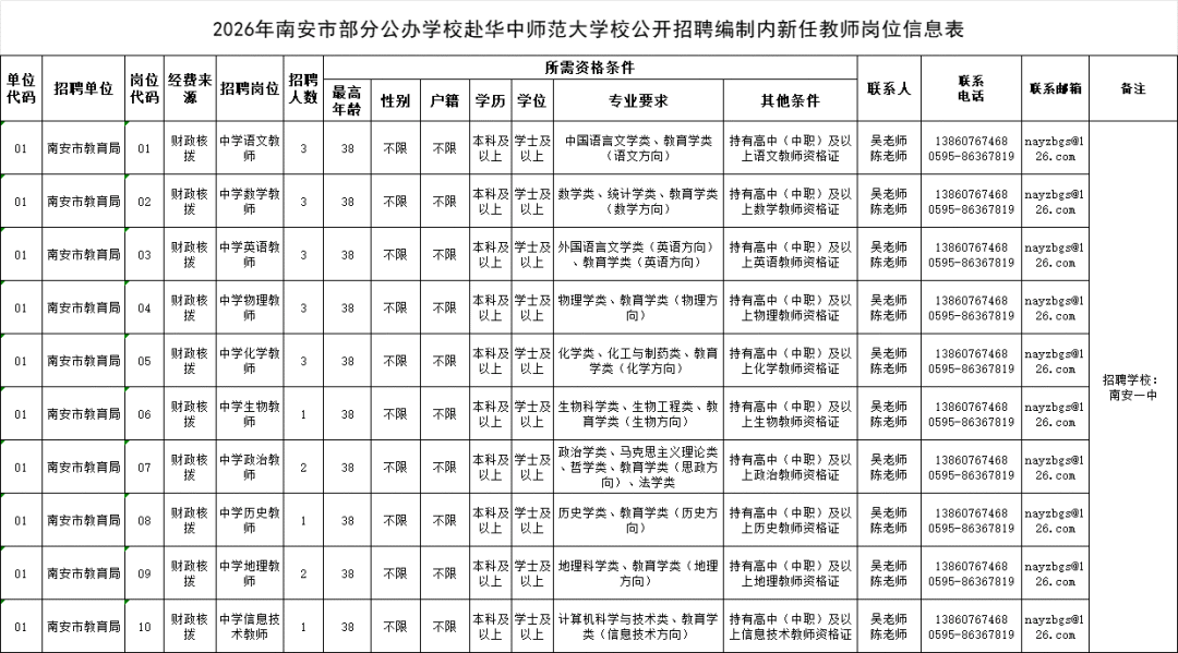 2026年南安市部分公办学校赴华中师范大学公开招聘编制内新任教师公告