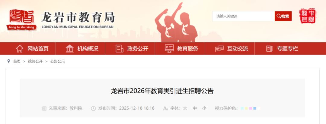 龙岩市教育局发布2026年教育类引进生招聘公告,决定重点从知名院校引进12名优秀毕业,作为龙岩市教育类引进生。