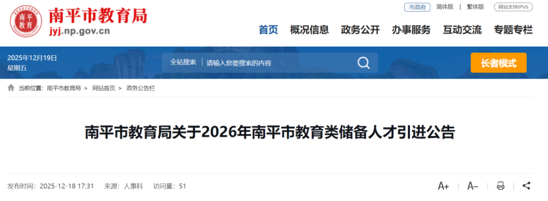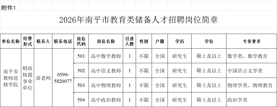 南平市教育局发布2026年南平市教育类储备人才引进公告,计划从“双一流”高校招聘引进4名教育类储备人才。