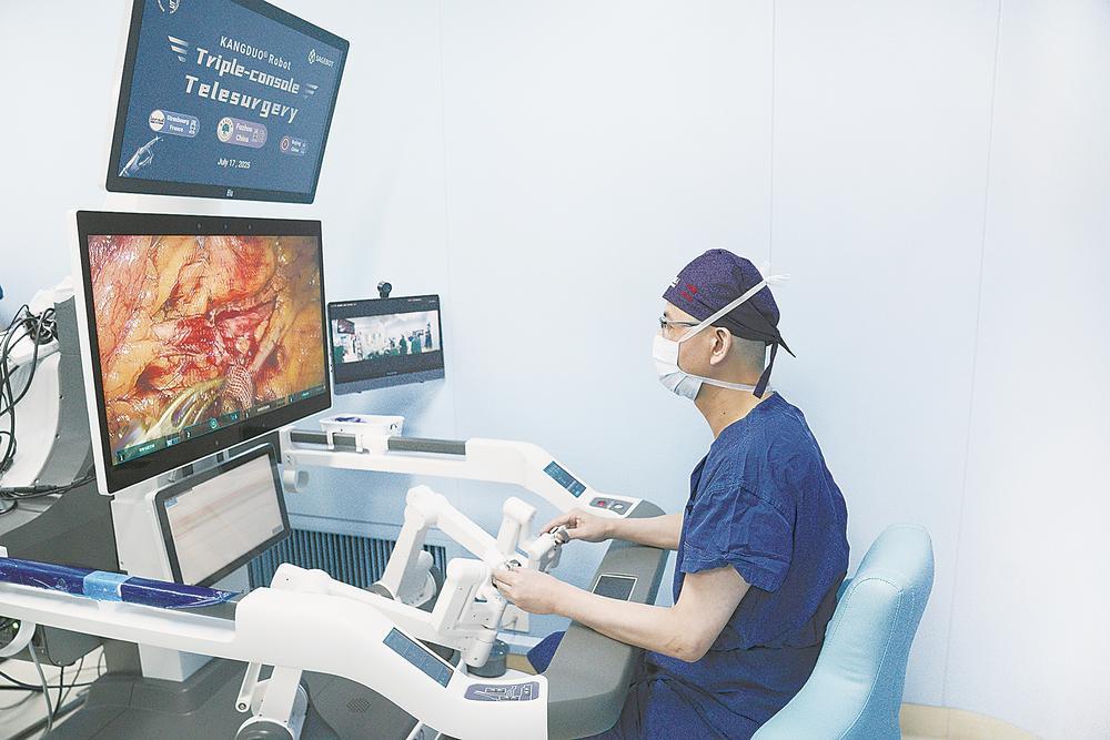 省立医院泌尿外科主任叶烈夫操作机器人进行远程手术。