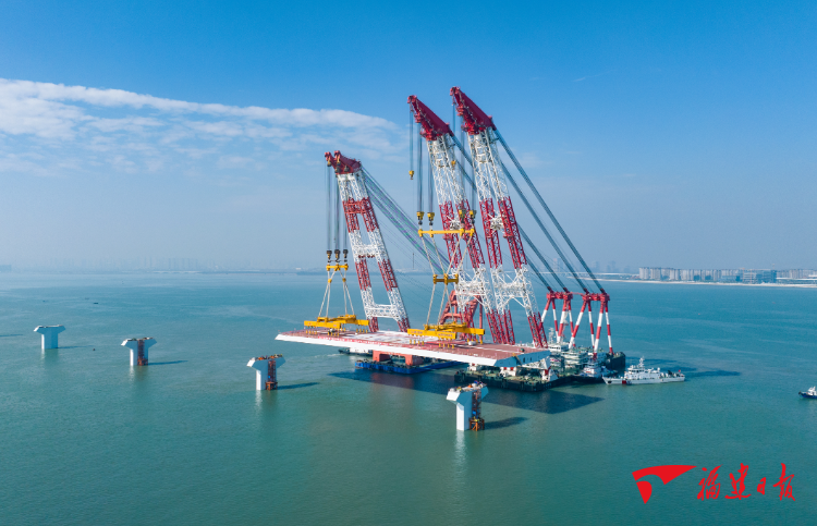 厦金大桥厦门段项目海上首榀钢箱梁正在吊装。图源:福建日报