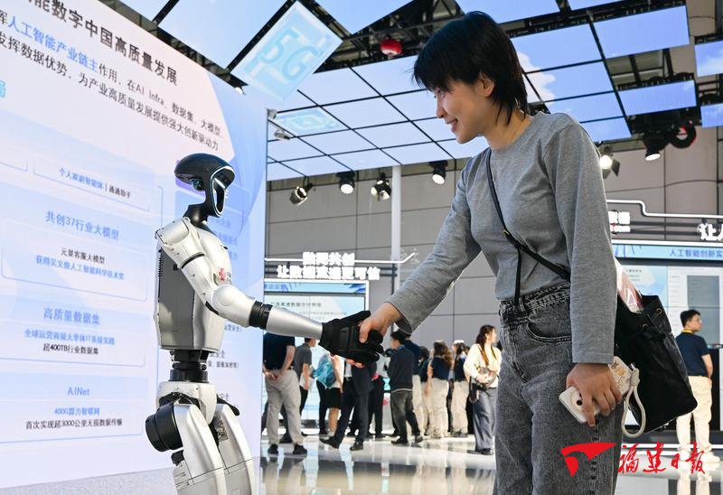 在第八届数字中国建设峰会体验区,观众和机器人握手和互动。福建日报记者 游庆辉 摄