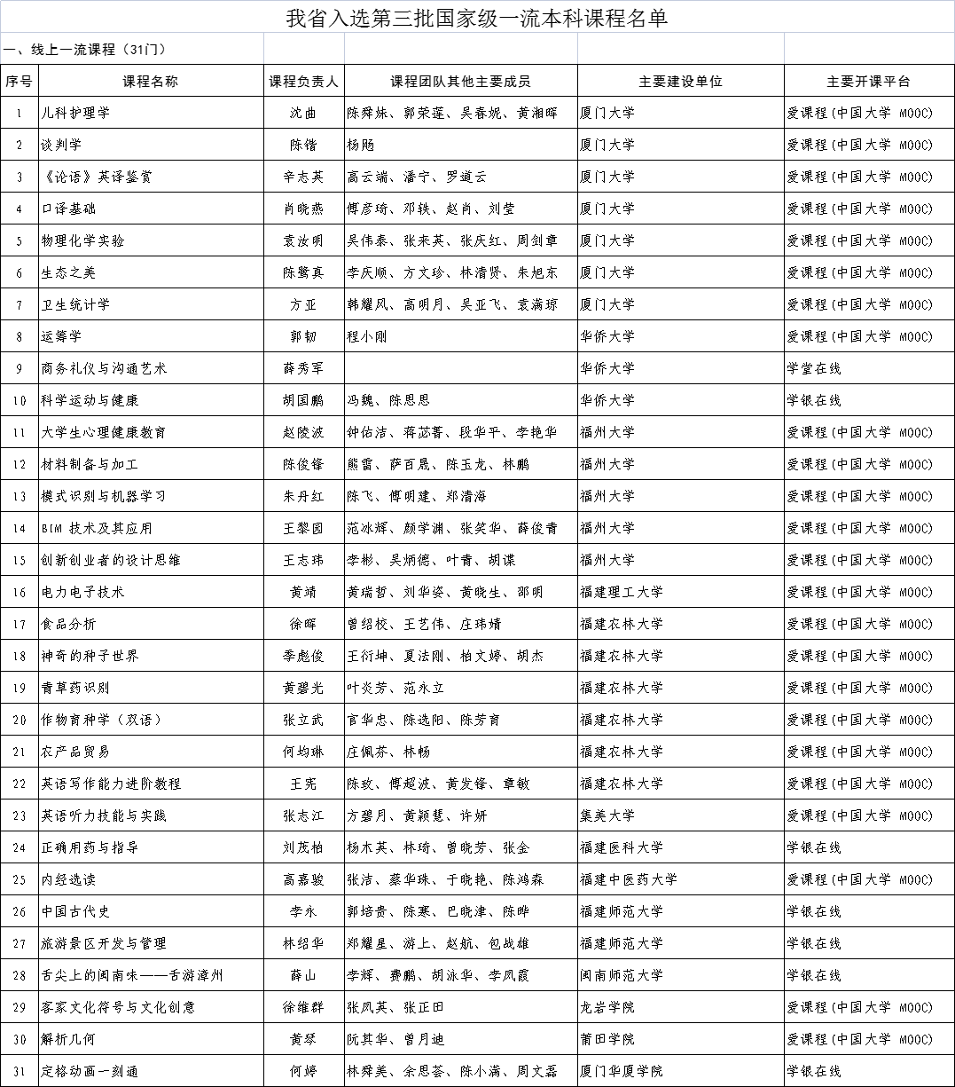 日前,教育部公布了第三批国家级一流本科课程认定结果。福建一流本科课程建设再创佳绩,共有34所本科高校197门课程入选,较上一批次增长23.9%,入选数量位列全国第13位。其中,线上一流课程31门,虚拟仿真实验教学一流课程32门,线上线下混合一流课程48门,线下一流课程62门,社会实践一流课程24门(名单附后)。