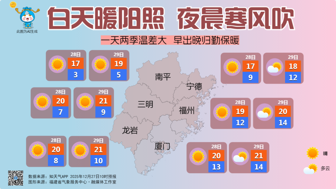 不过夜晨时分仍旧寒凉,昼夜温差较大,早出晚归仍需裹紧小棉袄。尤其是28日夜晨,南平、三明、宁德三市的大部和龙岩市西北部城区可达0~4°C,有霜或霜冻,高海拔地区的城区-1~0°C,有结冰。