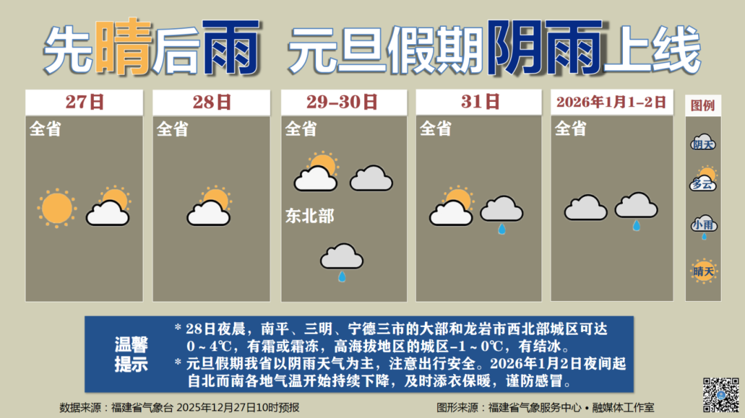 元旦假期福建以阴雨天气为主,降水可能导致道路湿滑、能见度降低,假期出行要注意交通安全。