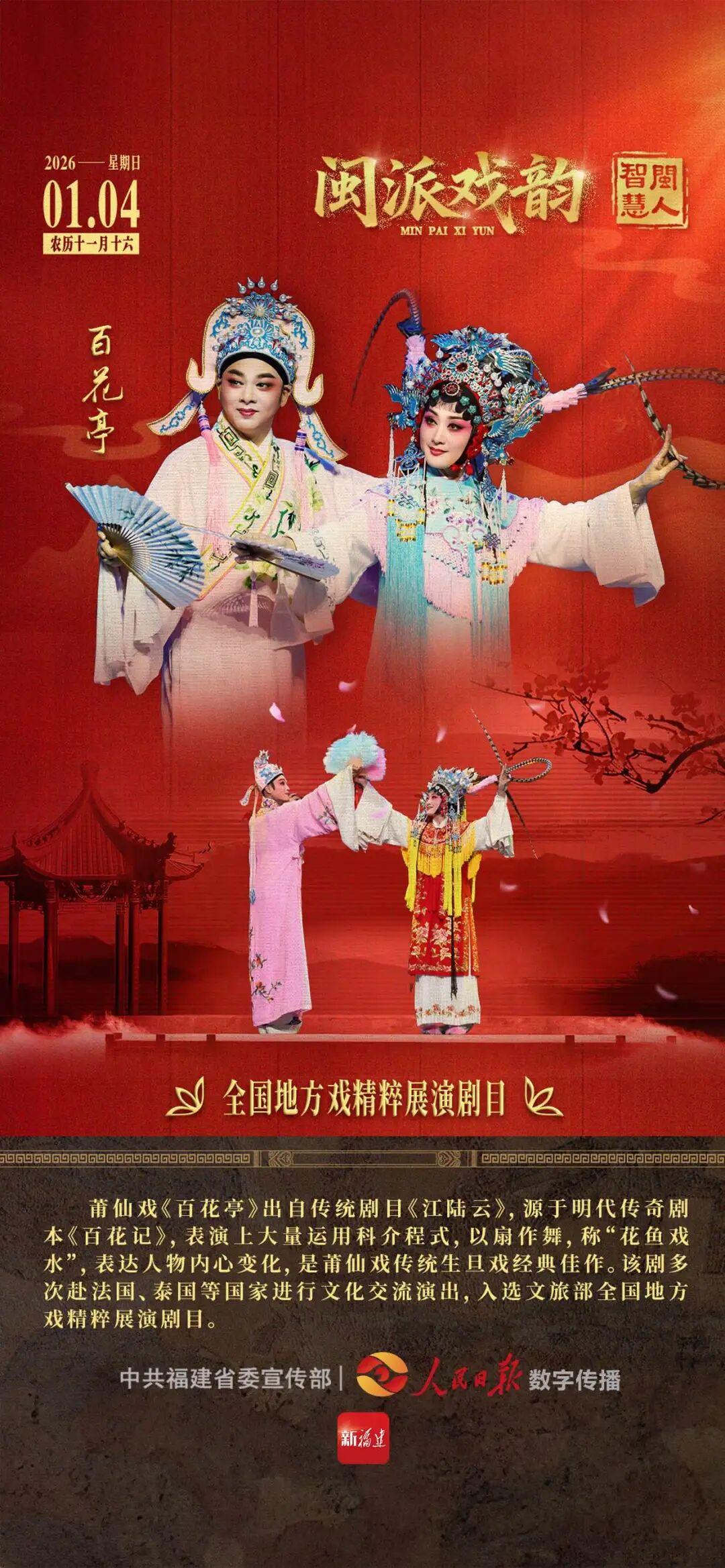 莆仙戏《百花亭》出自传统剧目《江陆云》,源于明代传奇剧本《百花记》,表演上大量运用科介程式,以扇作舞,称“花鱼戏水”,表达人物内心变化,是莆仙戏传统生旦戏经典佳作。该剧多次赴法国、泰国等国家进行文化交流演出,入选文旅部全国地方戏精粹展演剧目。