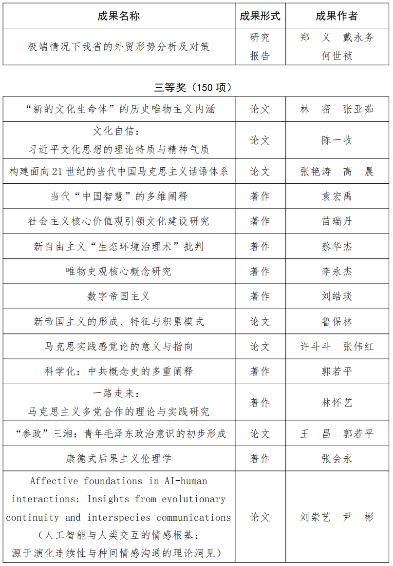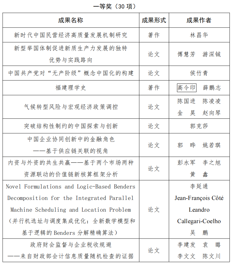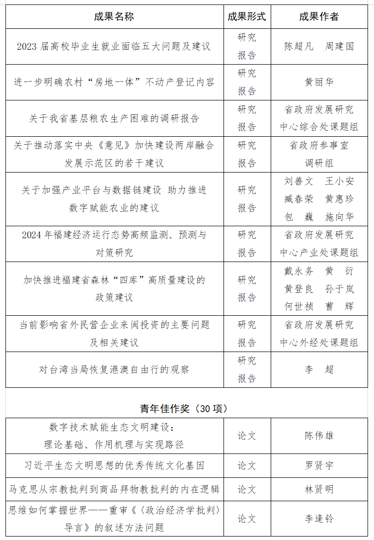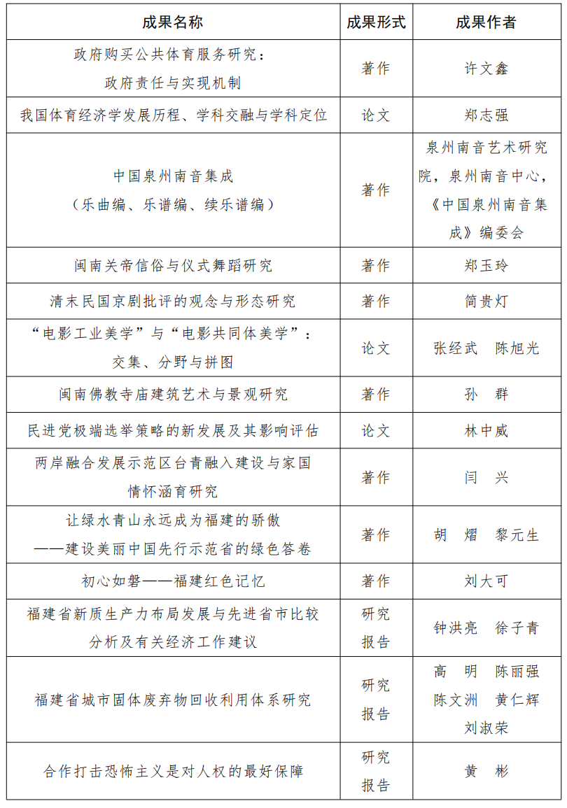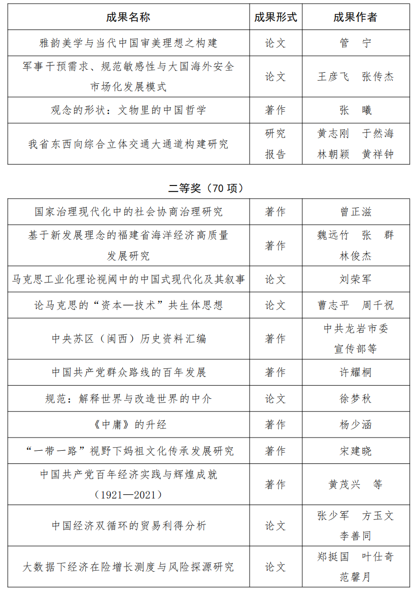 根据《福建省社会科学优秀成果奖励办法》,经研究,决定授予《新时代中国民营经济高质量发展机制研究》等30项成果福建省第十六届社会科学优秀成果一等奖,《国家治理现代化中的社会协商治理研究》等70项成果福建省第十六届社会科学优秀成果二等奖,《“新的文化生命体”的历史唯物主义内涵》等150项成果福建省第十六届社会科学优秀成果三等奖,《数字技术赋能生态文明建设:理论基础、作用机理与实现路径》等30项成果福建省第十六届社会科学优秀成果青年佳作奖。