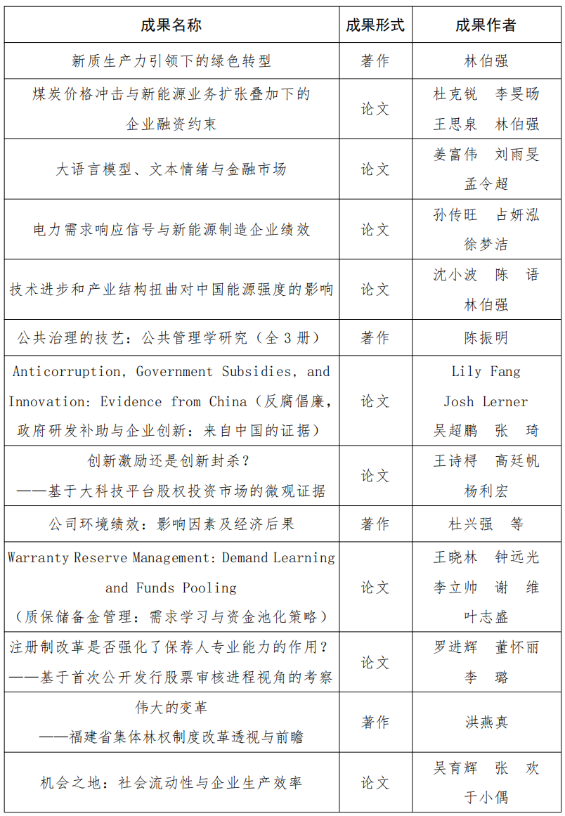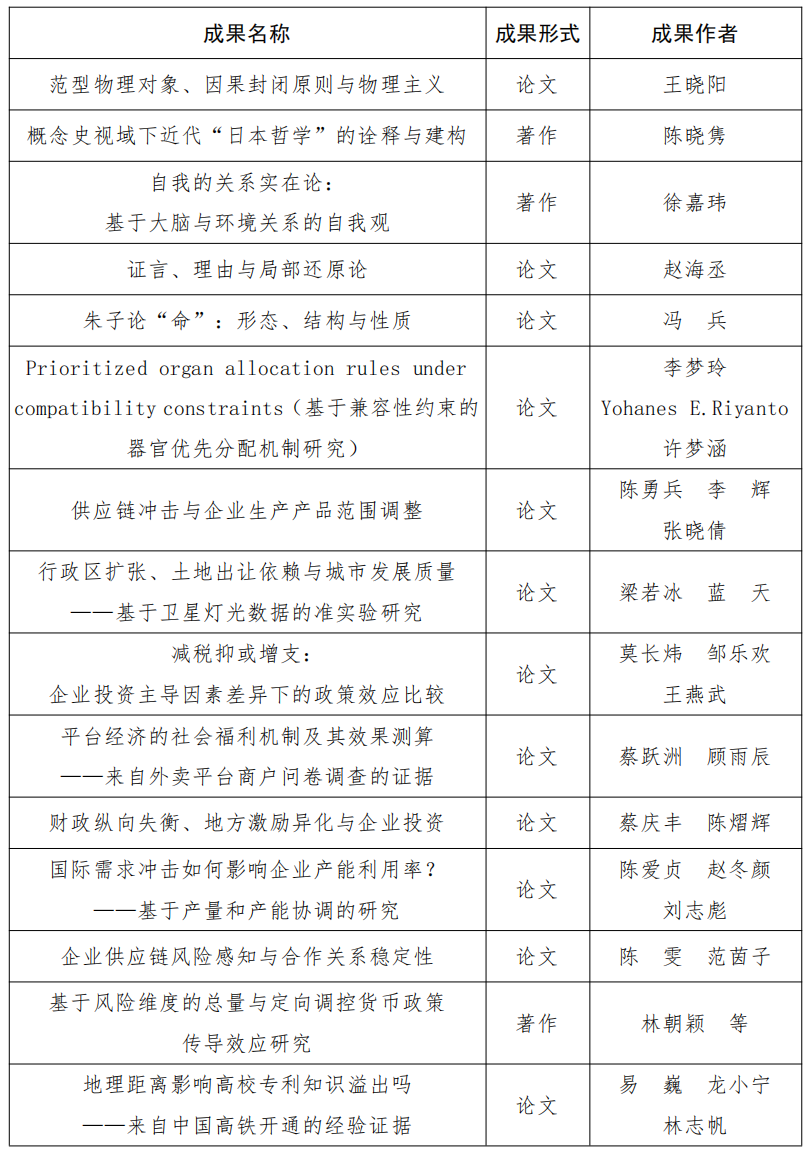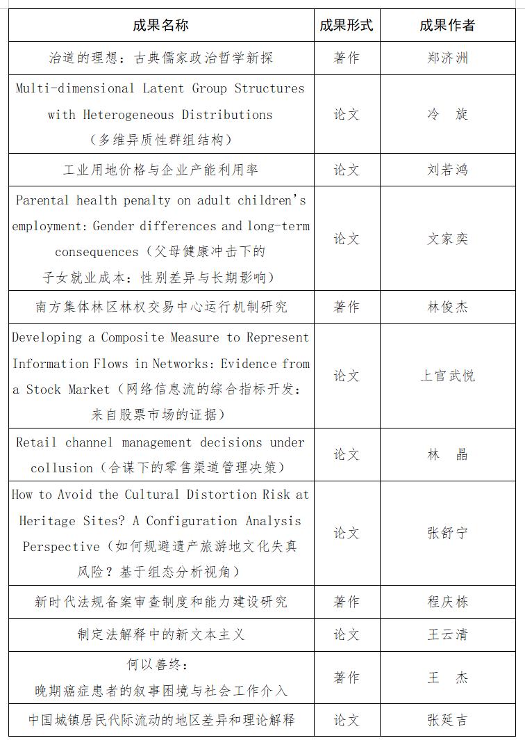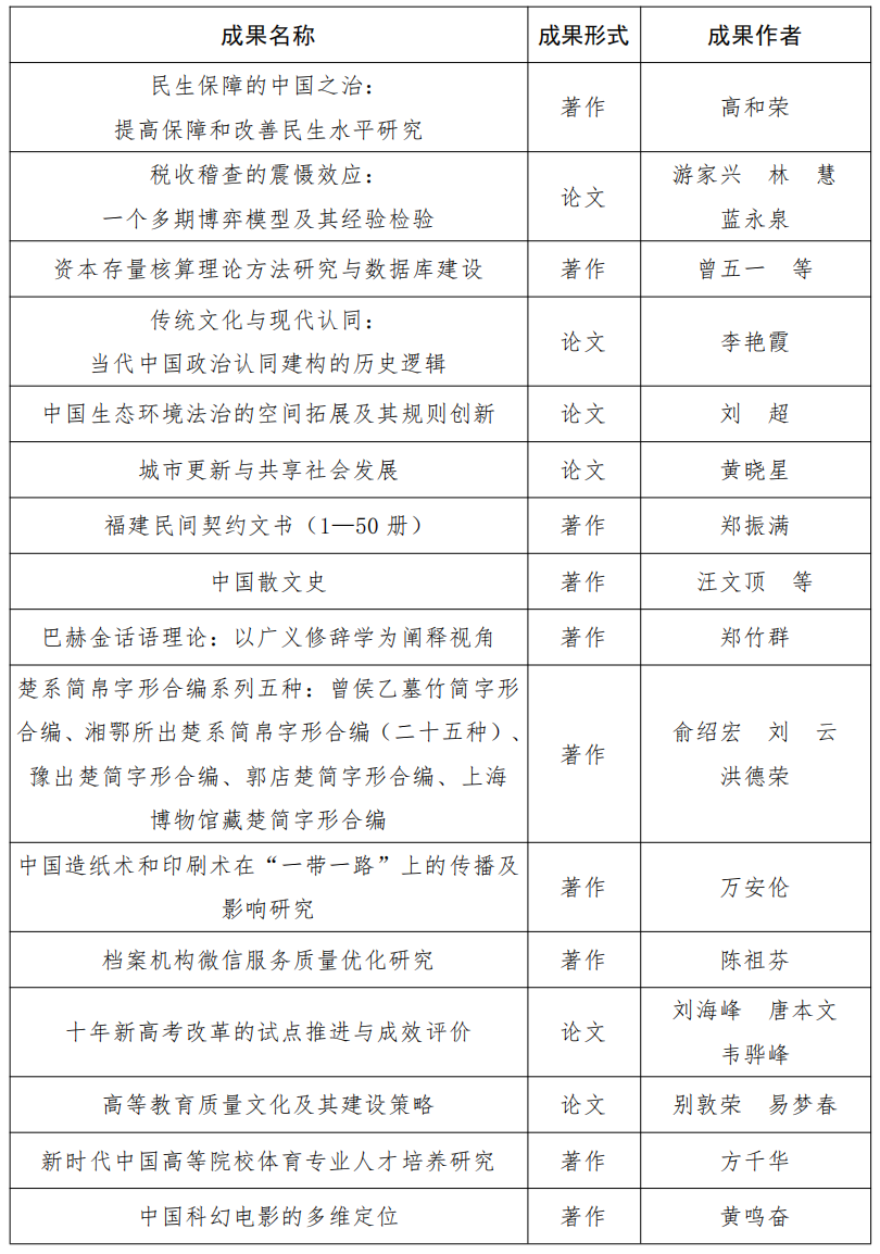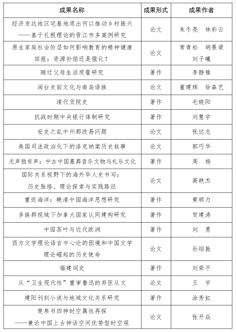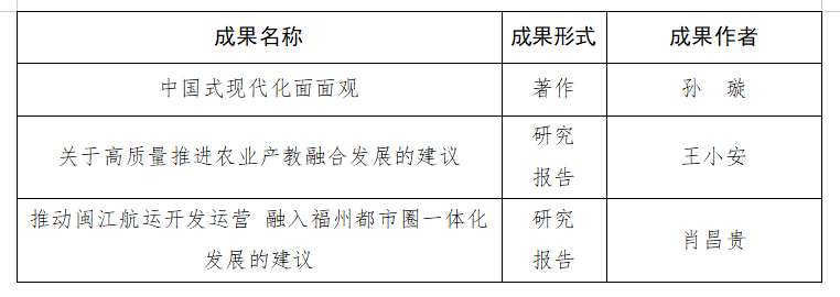 根据《福建省社会科学优秀成果奖励办法》,经研究,决定授予《新时代中国民营经济高质量发展机制研究》等30项成果福建省第十六届社会科学优秀成果一等奖,《国家治理现代化中的社会协商治理研究》等70项成果福建省第十六届社会科学优秀成果二等奖,《“新的文化生命体”的历史唯物主义内涵》等150项成果福建省第十六届社会科学优秀成果三等奖,《数字技术赋能生态文明建设:理论基础、作用机理与实现路径》等30项成果福建省第十六届社会科学优秀成果青年佳作奖。