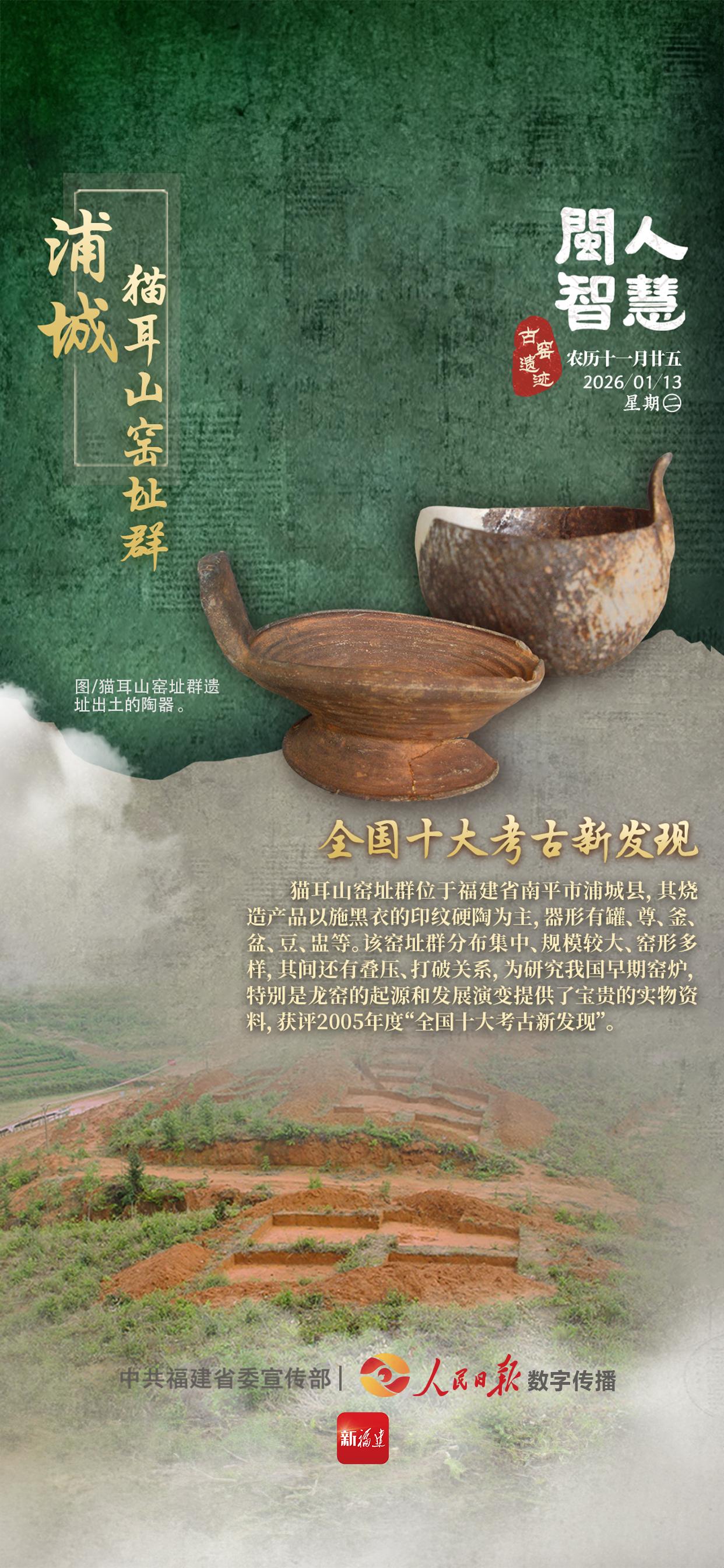猫耳山窑址群位于福建省南平市浦城县,其烧造产品以施黑衣的印纹硬陶为主,器形有罐、尊、釜、盆、豆、盅等。该窑址群分布集中、规模较大、窑形多样,其间还有叠压、打破关系,为研究我国早期窑炉,特别是龙窑的起源和发展演变提供了宝贵的实物资料,获评2005年度“全国十大考古新发现”。