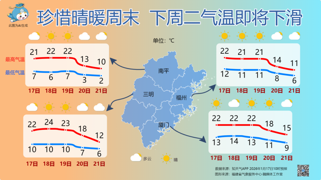刚经历过一波回暖,福建的冬天好似变回小阳春,不过虽然中午阳光加持有明显暖意,但早晚依旧是寒冷,早晚出行公众依然要做好防寒措施,但这样的晴暖天气开始进入尾声,下周二20日全省范围气温均有明显下滑,降温幅度普遍在5℃上下。