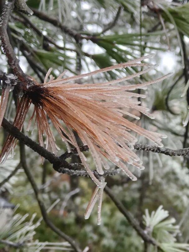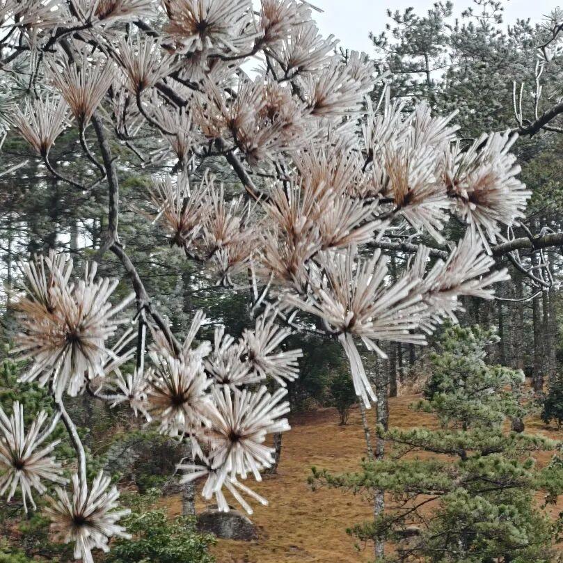 1月21日受冷空气影响,屏南仙山牧场出现雾凇景观,深褐的松针被透明的冰晶裹得蓬松舒展,宛如无数支凝住的银菊,在湿冷的空气里泛着细腻的光泽。(图/文:吴艳芳)