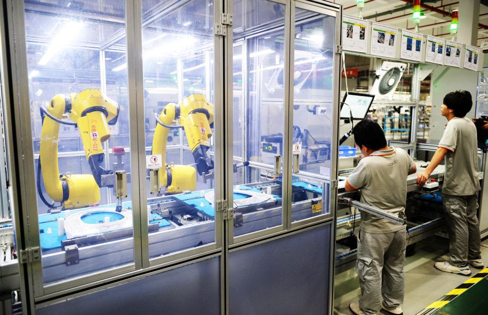 在九牧集团的5G智能马桶工厂,工人们正在作业。图源:新华社记者刘勇贞 摄