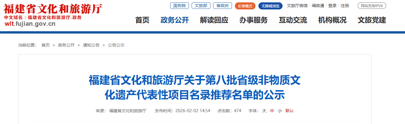 日前,福建省文化和旅游厅发布最新公示,拟将81个第八批省级非物质文化遗产代表性项目名录推荐名单向社会公示,公示期自2026年2月2日至2月21日止,详情——