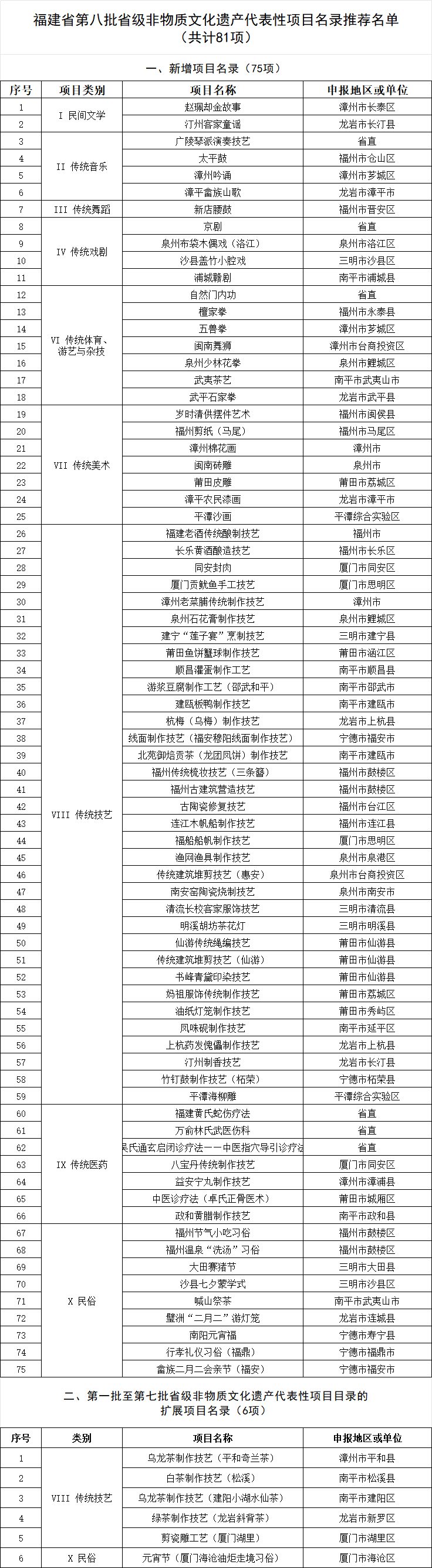 为深入学习贯彻习近平文化思想,进一步推动非物质文化遗产系统性保护,根据《福建省非物质文化遗产条例》《福建省非物质文化遗产名录申报评审管理暂行办法》的有关规定,2025年9月,福建省文化和旅游厅开展了第八批省级非物质文化遗产代表性项目申报工作。2026年1月,福建省文化和旅游厅组织专家对全省各地市以及省直部门申报的148个项目进行了评审。之后,评审委员会进行了审议并经厅务会研究,提出第八批省级非物质文化遗产代表性项目名录推荐名单81项,其中,新增项目75项,扩展项目6项。