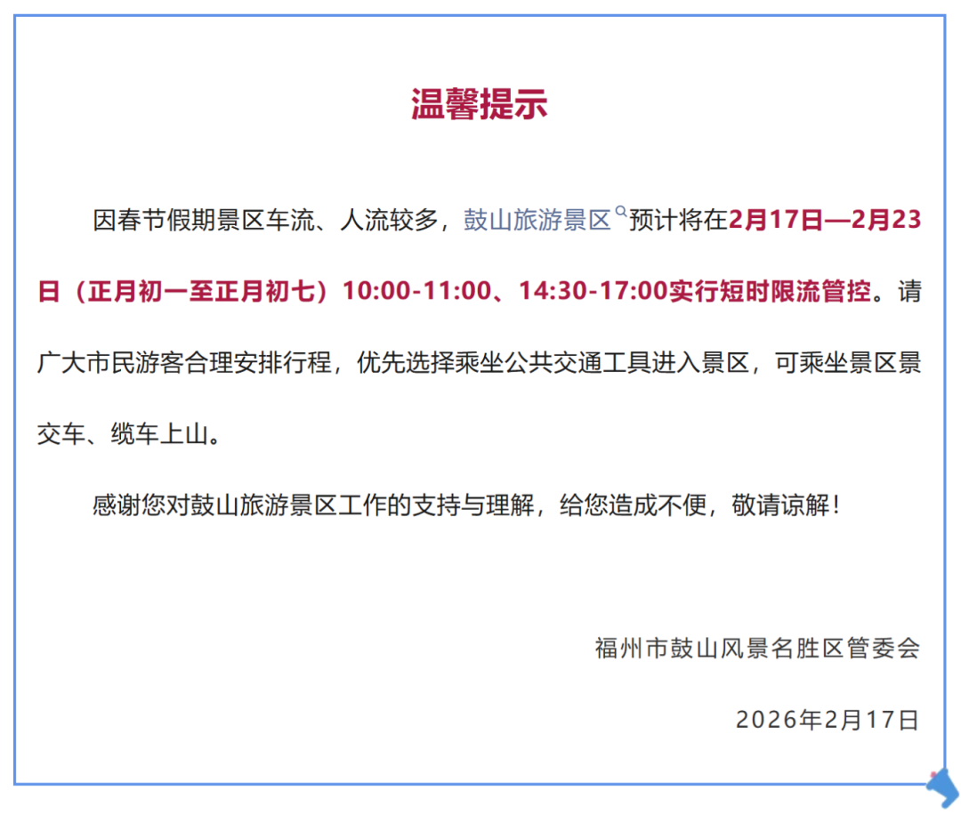 鼓山旅游景区预计将在2月17日至2月23日(正月初一至正月初七)10:00-11:00、14:30-17:00,实行短时限流管控。