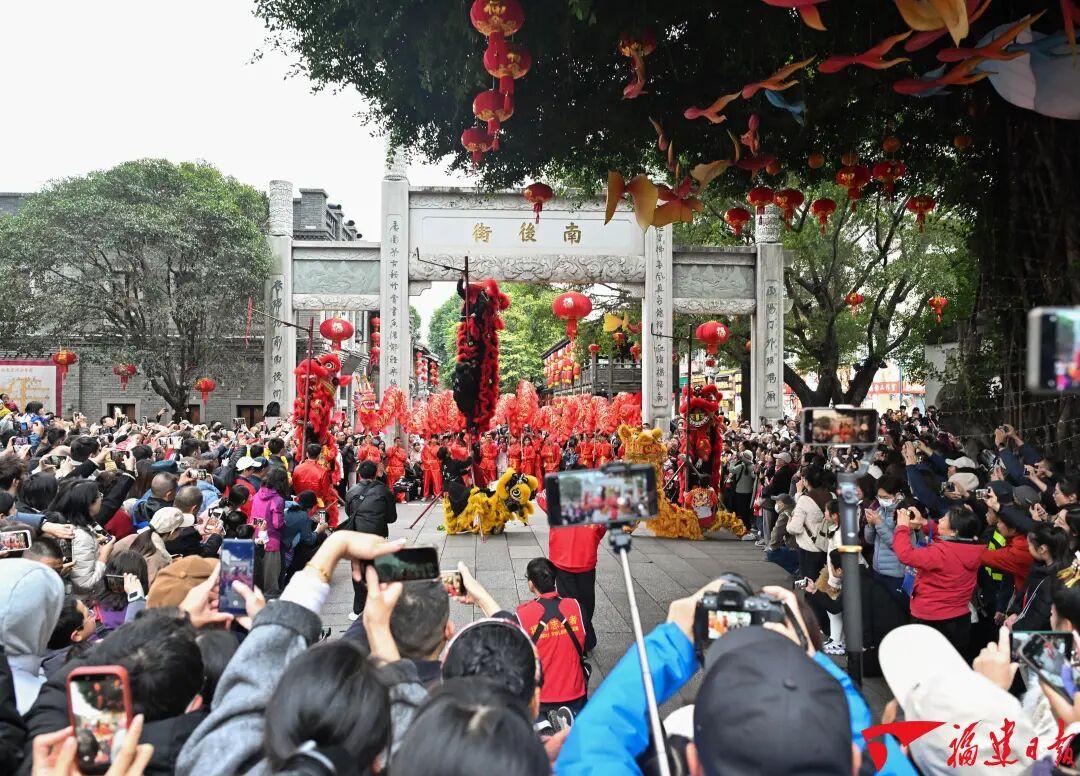 2月17日,福州南后街牌坊前热闹欢腾,舞龙、醒狮表演精彩绝伦。福建日报记者 游庆辉 摄