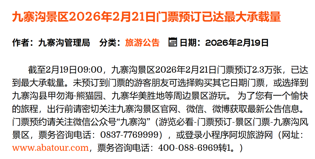 四川九寨沟景区发布公告,2月21日门票预订2.3万张,已达到最大承载量。