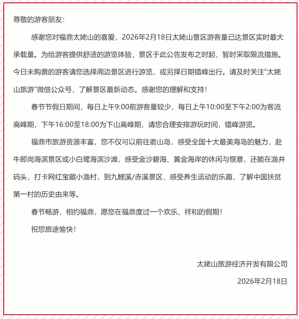 太姥山景区发布限流公告,春节节假日期间,每日上午9:00前游客量较少,每日上午10:00至下午2:00为客流高峰期,16:00至18:00为下山高峰期。