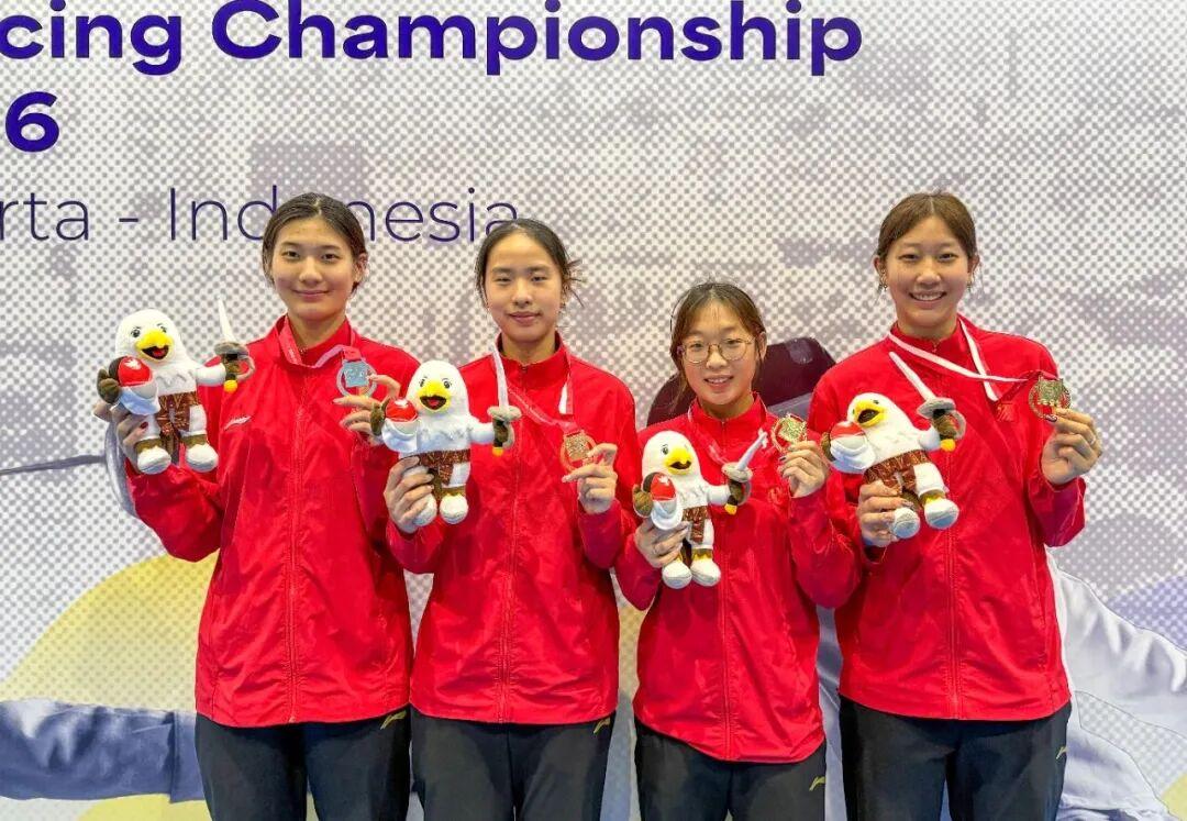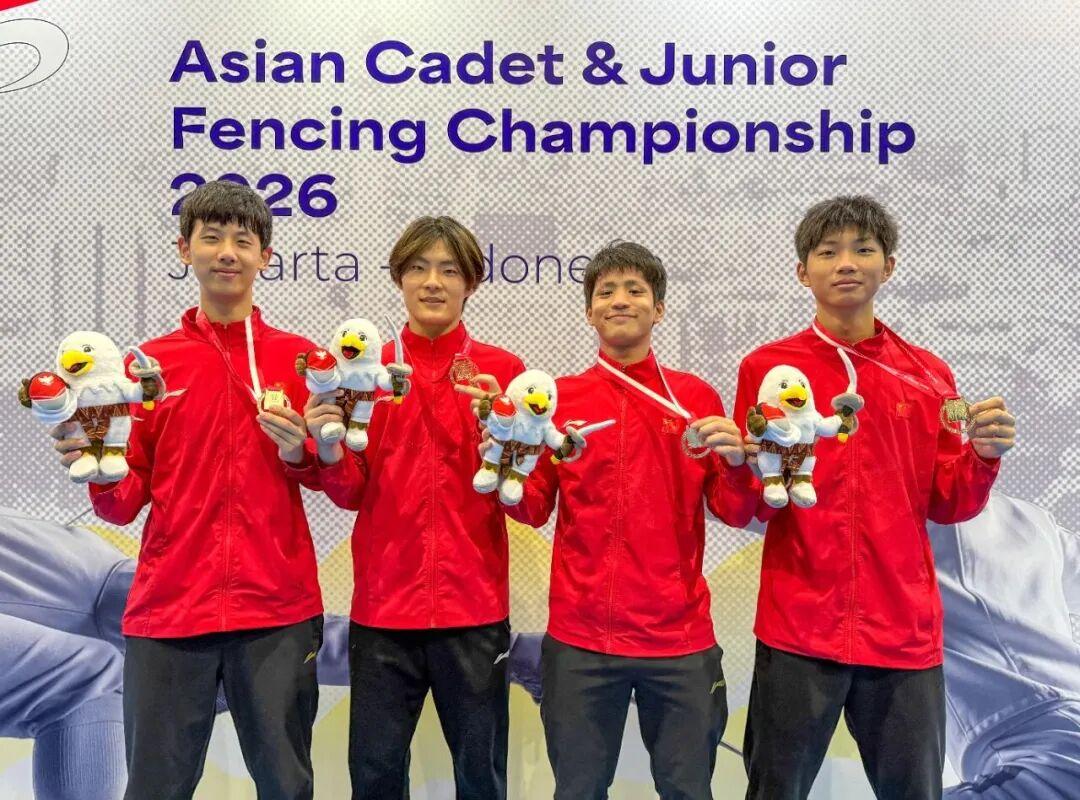 2月27日,2026年亚洲青年击剑锦标赛圆满收官,中国队在本届亚青赛中以8金1银1铜的傲人战绩稳居金牌榜首位!福建击剑小将林炜乐、张鑫榕、焦恩祺表现出色,携手队友为中国队拿下男花团体、女重团体、女花团体3枚金牌!
