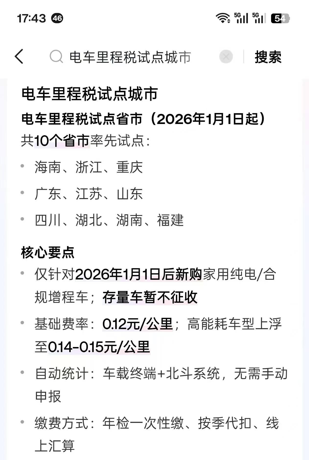 图片中显示,“新能源汽车里程税,征收对象为2026年1月1日后新上牌的纯电、合规插混/增程车,家用轻型车(车重2.5吨、电耗≤15KWh/100km)的基础费率为每公里0.12元,超重/高耗电的车型费率上浮至0.14~0.15元/公里。计费方式通过车载终端与北斗系统自动记录行驶里程,无需车主手动申报,缴费方式支持年检时一次性缴纳、绑定银行卡按季度代扣、政务APP年度汇算”。