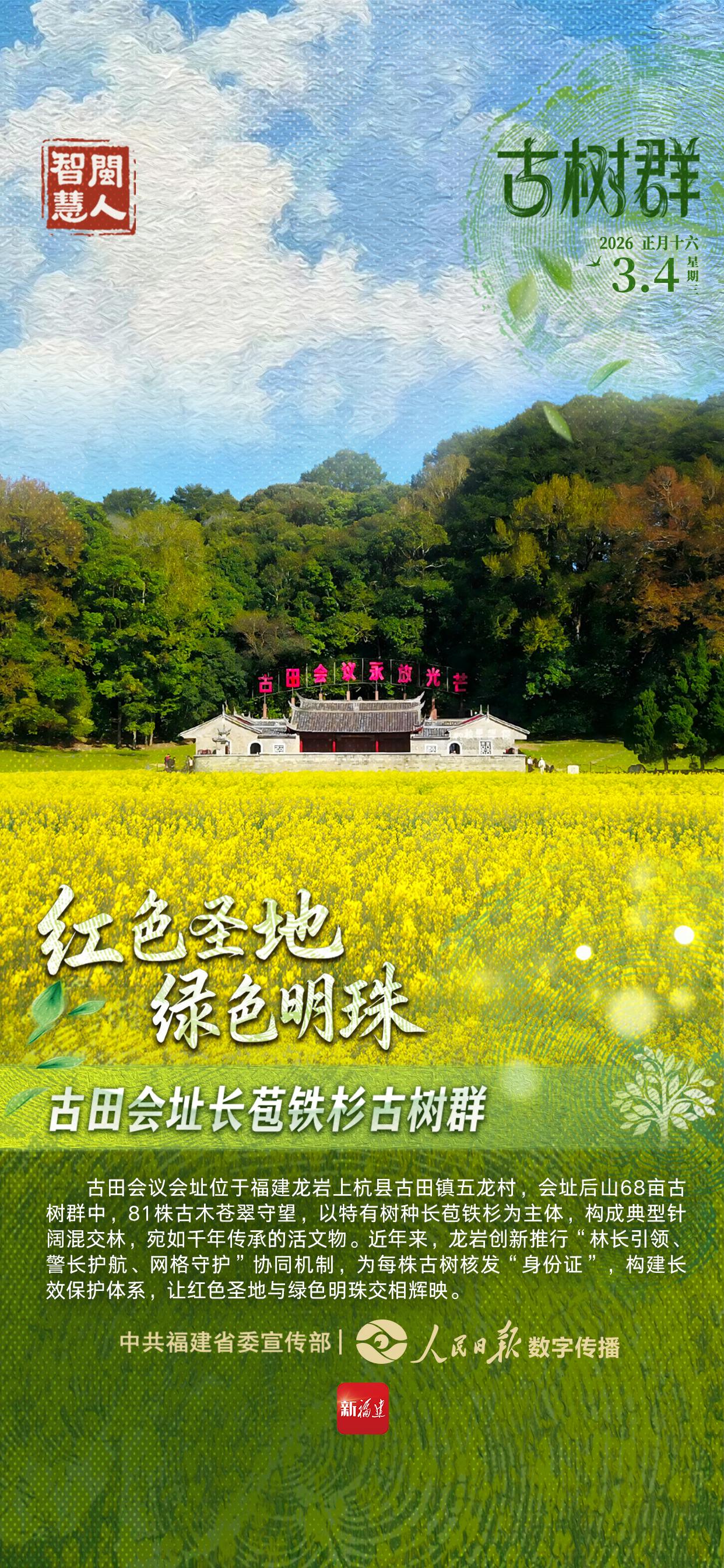 古田会议会址位于福建龙岩上杭县古田镇五龙村,会址后山68亩古树群中,81株古木苍翠守望,以特有树种长苞铁杉为主体,构成典型针阔混交林,宛如千年传承的活文物。近年来,龙岩创新推行“林长引领、警长护航、网格守护”协同机制,为每株古树核发“身份证”,构建长效保护体系,让红色圣地与绿色明珠交相辉映。