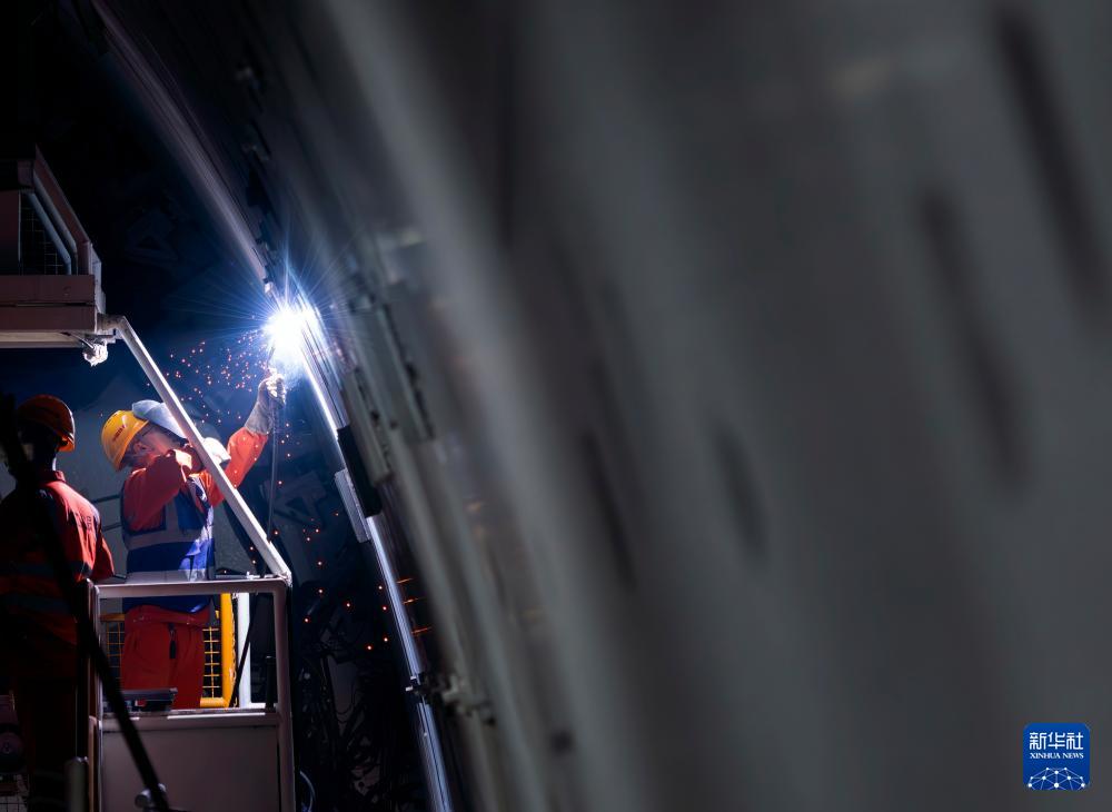 3月4日,中铁十四局工程作业人员在对隧道内管片进行焊接加固。新华社记者 魏培全 摄