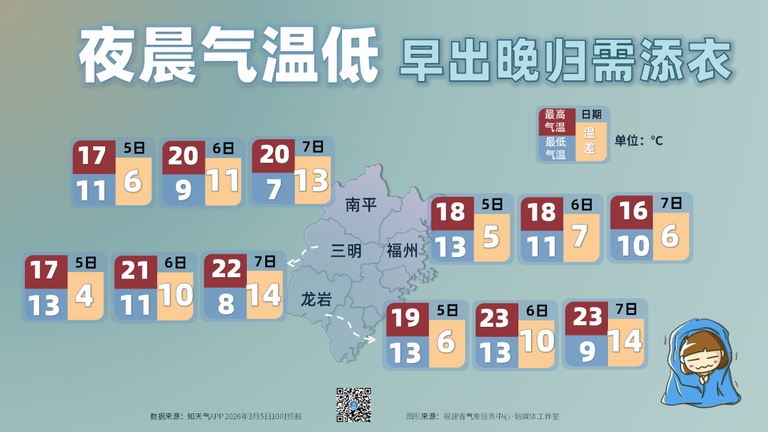 5日,全省阴转多云,中东部地区部分有小雨,其余地区局部有小雨。6日、7日两天,随着暖湿气流减弱,福建的降水将逐步减弱,但仍有零星弱降水。6日,全省多云到阴,局部有小雨。7日,全省以多云天气为主。朋友们外出需带好雨具、注意防滑。