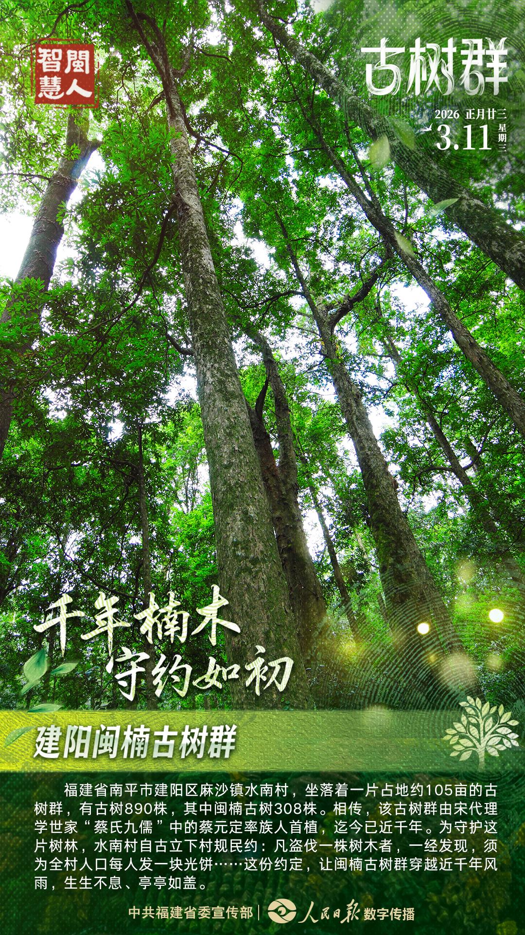 福建省南平市建阳区麻沙镇水南村,坐落着一片占地约105亩的古树群,有古树890株,其中闽楠古树308株。相传,该古树群由宋代理学世家“蔡氏九儒”中的蔡元定率族人首植,迄今已近千年。为守护这片树林,水南村自古立下村规民约:凡盗伐一株树木者,一经发现,须为全村人口每人发一块光饼……这份约定,让闽楠古树群穿越近千年风雨,生生不息、亭亭如盖。