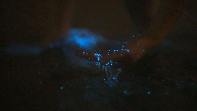 “蓝眼泪”是一种可遇不可求的自然现象,由一些个体微小、会发光的浮游生物形成。比如,夜光藻体内有荧光素酶和荧光素,当受到外界扰动时,荧光素会和氧气发生反应,这个过程会释放蓝光。每年4月至6月是“蓝眼泪”的高发期。
