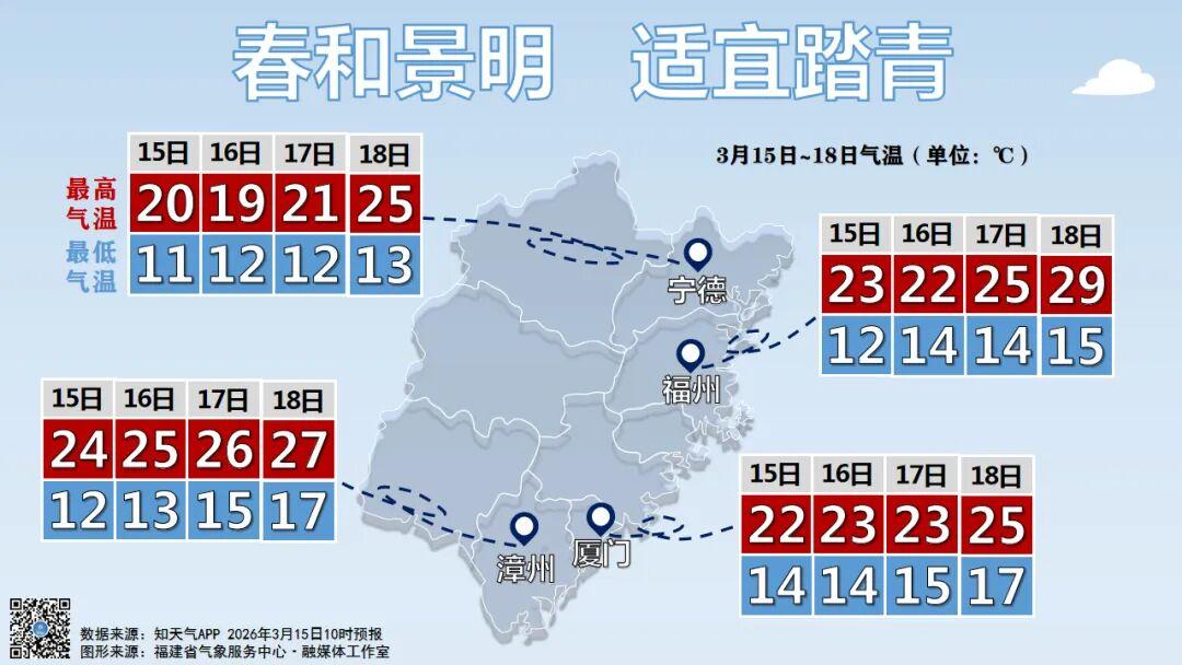 未来三天,福建继续维持晴好天气。15日,全省晴到多云,局部有阵雨。16日,全省多云到阴,局部有阵雨。17日,全省多云到阴,局部有阵雨。不妨约上三五好友,探一探山河美景。省会福州的乌龙江湿地公园、梁厝特色历史文化街区和花海公园等地成片的花海正在绽放,适合春季踏青赏花。建议公众提前规划好路线,错峰出游。
