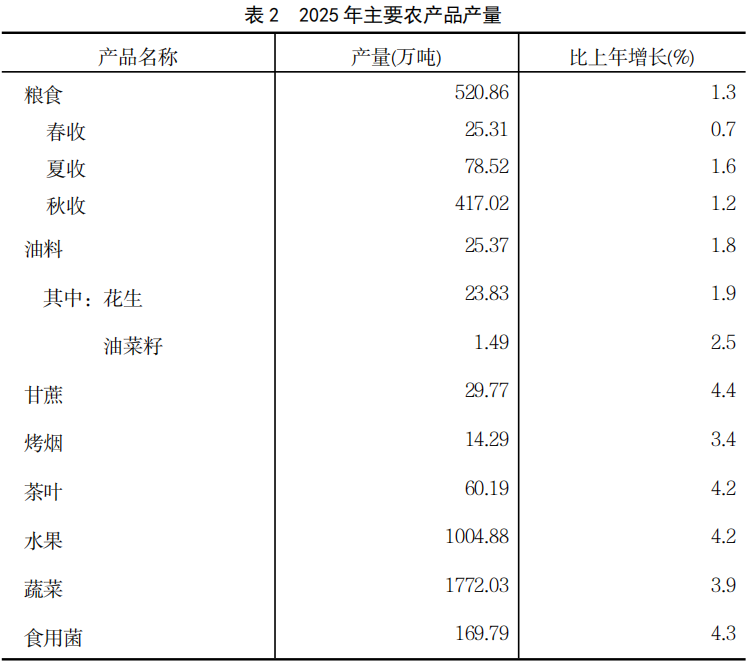全年农林牧渔业总产值5943.96亿元,比上年增长3.6%。粮食种植面积847.31千公顷,比上年增加2.90千公顷。粮食产量520.86万吨,比上年增加6.47万吨,增长1.3%。其中,稻谷产量404.85万吨,增加7.17万吨,增长1.8%。
