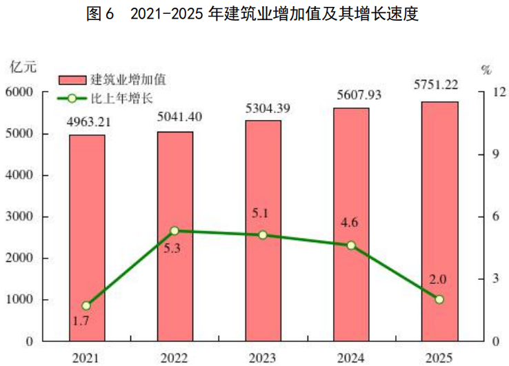 全年建筑业增加值5751.22亿元,比上年增长2.0%。具有资质等级的总承包和专业承包建筑业企业完成建筑业总产值18655.27亿元,增长0.2%。