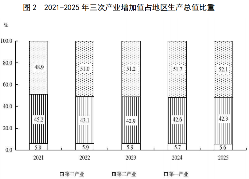初步核算,全年实现地区生产总值[2]60199.45亿元,比上年增长5.0%。其中,第一产业增加值3354.37亿元,增长3.6%;第二产业增加值25497.34亿元,增长5.1%;第三产业增加值31347.74亿元,增长5.1%。第一产业增加值占地区生产总值的比重为5.6%,第二产业增加值比重为42.3%,第三产业增加值比重为52.1%。全年人均地区生产总值143623元,比上年增长4.9%。