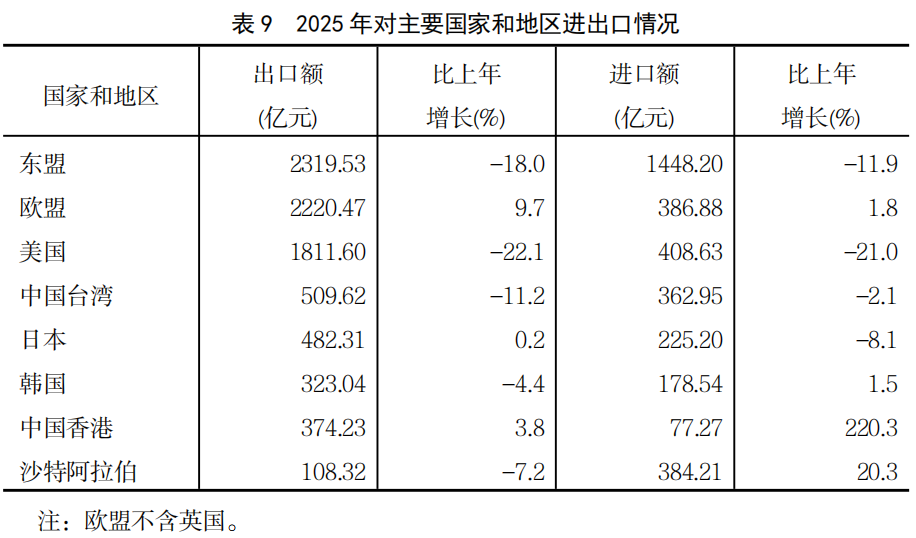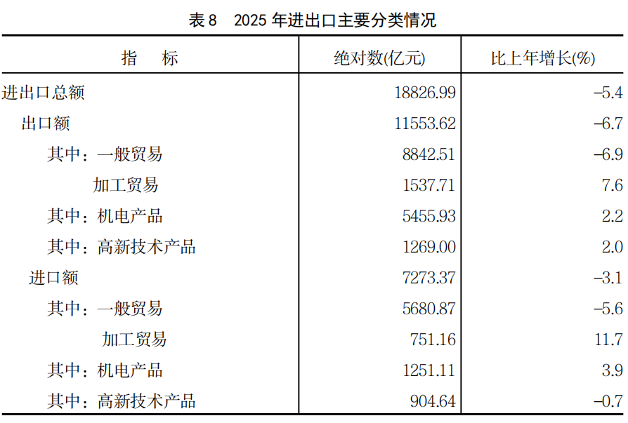 全年货物进出口总额18826.99亿元,比上年下降5.4%。其中,出口额11553.62亿元,下降6.7%;进口额7273.37亿元,下降3.1%。
