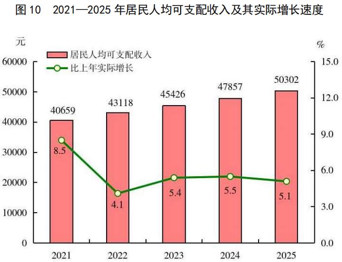 全年居民人均可支配收入50302元,比上年增长5.1%,扣除价格因素,实际增长5.1%。按常住地分,农村居民人均可支配收入30162元,增长5.7%,扣除价格因素,实际增长6.0%;城镇居民人均可支配收入61437元,增长4.5%,扣除价格因素,实际增长4.4%。城乡居民人均可支配收入比值为2.04,比上年缩小0.02。