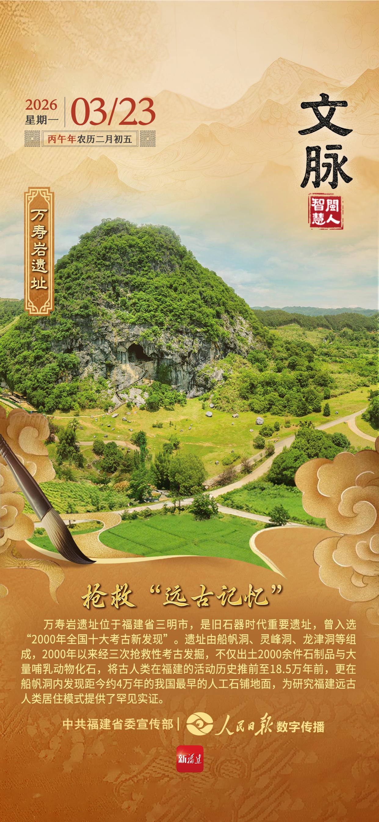 万寿岩遗址位于福建省三明市,是旧石器时代重要遗址,曾入选“2000年全国十大考古新发现”。遗址由船帆洞、灵峰洞、龙津洞等组成,2000年以来经三次抢救性考古发掘,不仅出土2000余件石制品与大量哺乳动物化石,将古人类在福建的活动历史推前至18.5万年前,更在船帆洞内发现距今约4万年的我国最早的人工石铺地面,为研究福建远古人类居住模式提供了罕见实证。