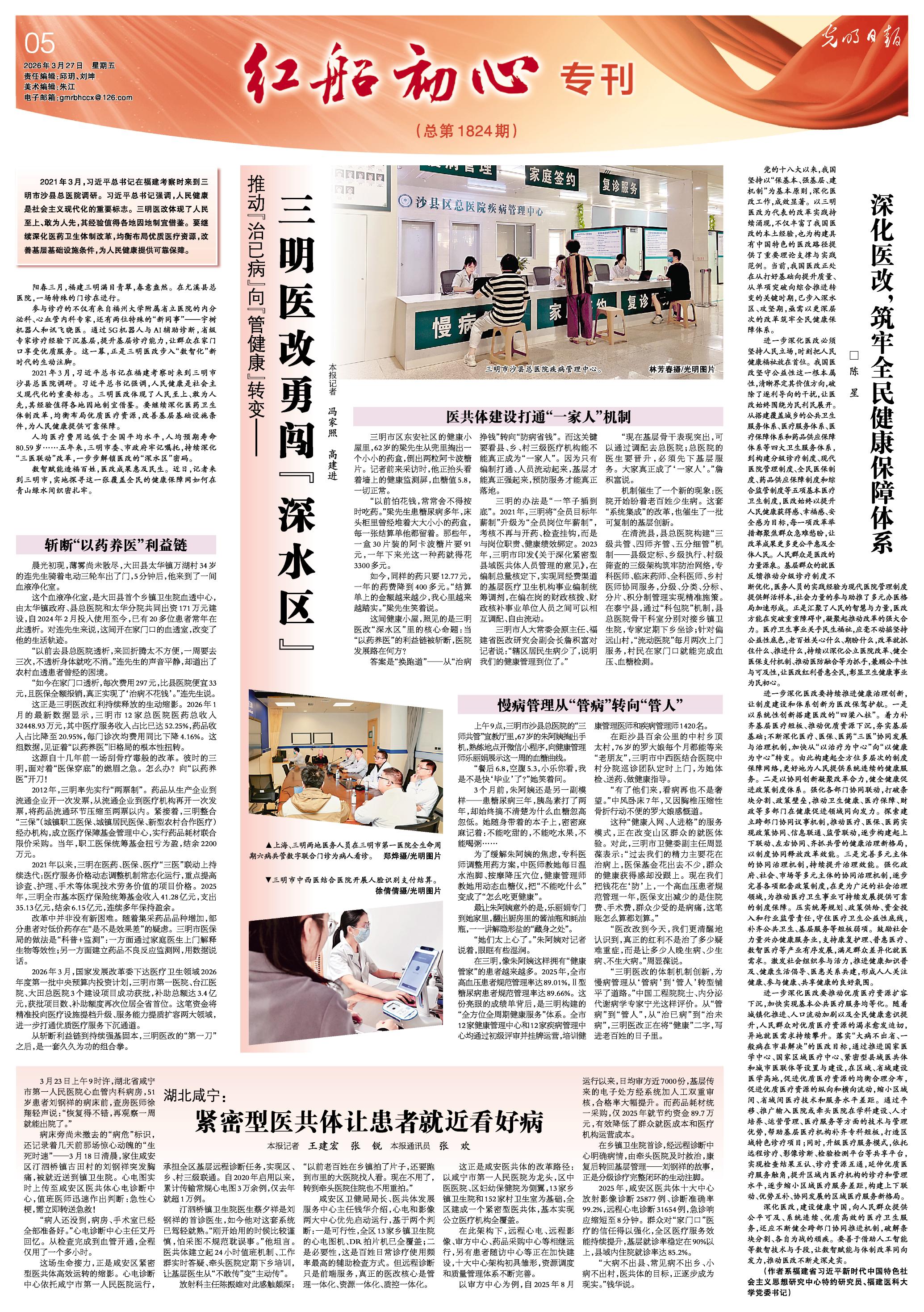 3月27日,《光明日报》05版聚焦福建三明持续深化“三医联动”改革,解锁医改“深水区”密码。报道包括:《推动“治已病”向“管健康”转变——三明医改勇闯“深水区”》《深化医改,筑牢全民健康保障体系》。一起来看详情——
