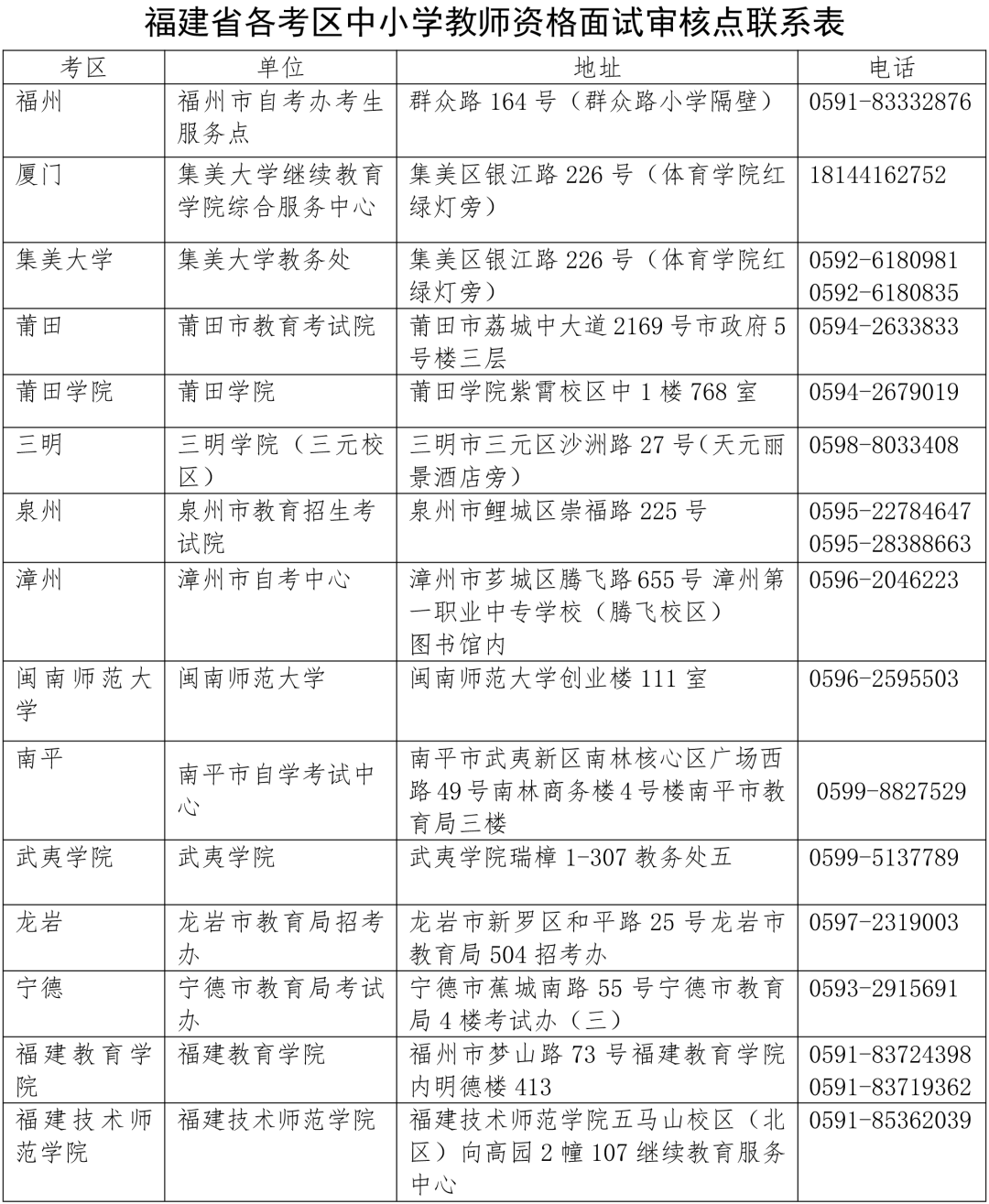 附件:福建省各考区中小学教师资格面试审核点联系表