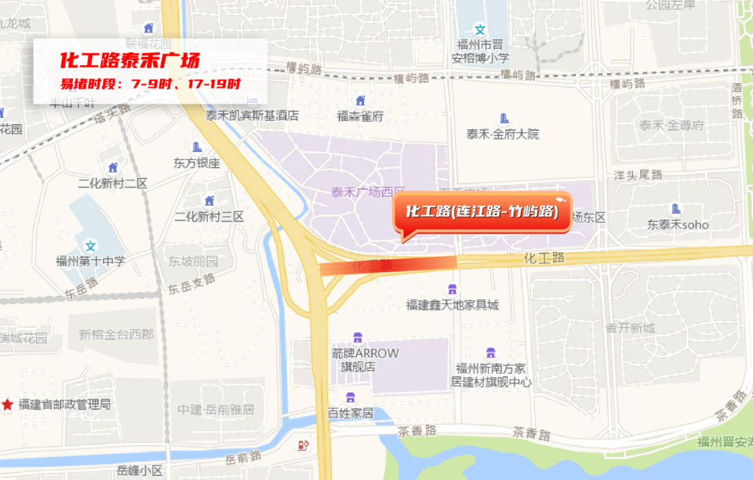 易堵路段为化工路(连江路-竹屿路),易堵时段为7-9时、17-19时,高峰通行速度预计为35公里/小时,预计拥堵状态为严重拥堵。