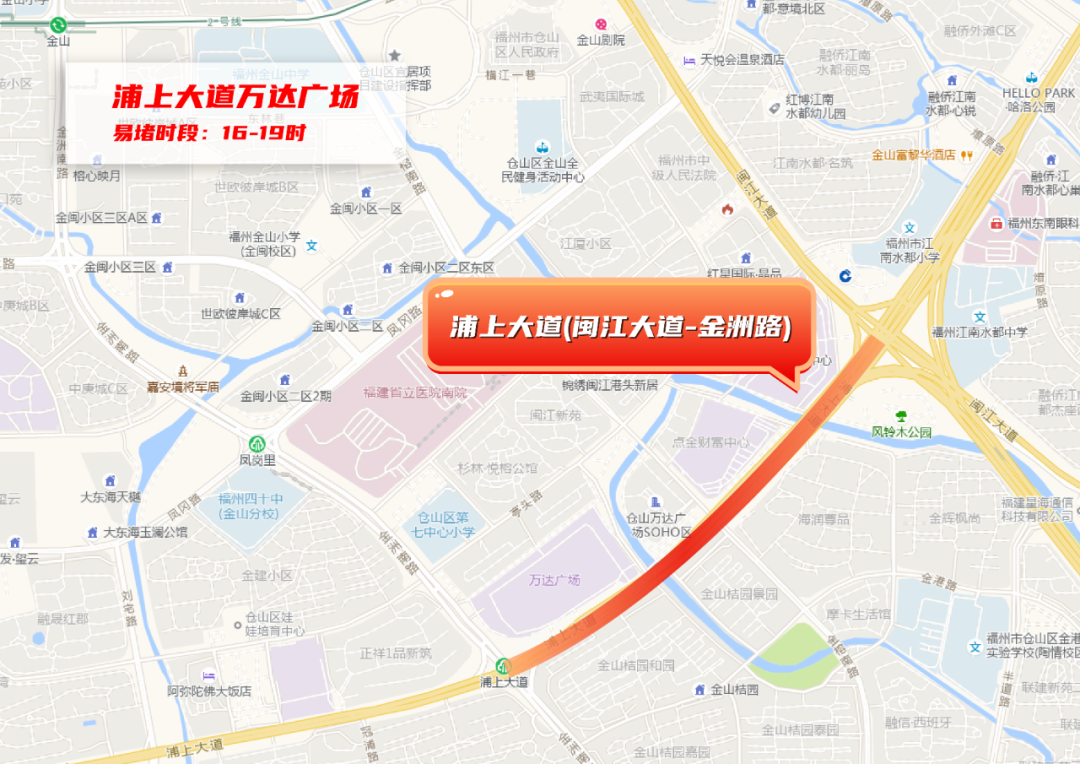 易堵路段为浦上大道(闽江大道-金洲路),易堵时段为16-19时,高峰通行速度预计为30公里/小时,预计拥堵状态为严重拥堵。