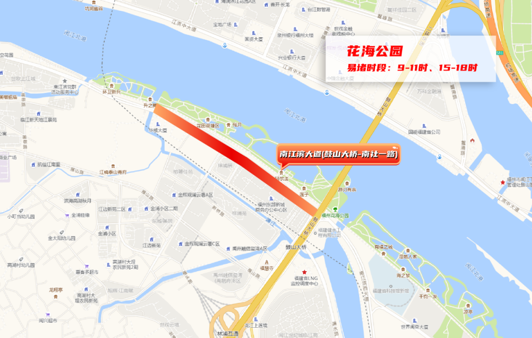 易堵路段为南江滨大道(鼓山大桥-南社一路),易堵时段为9-11时、15-18时,高峰通行速度预计为40公里/小时,预计拥堵状态为中度拥堵。