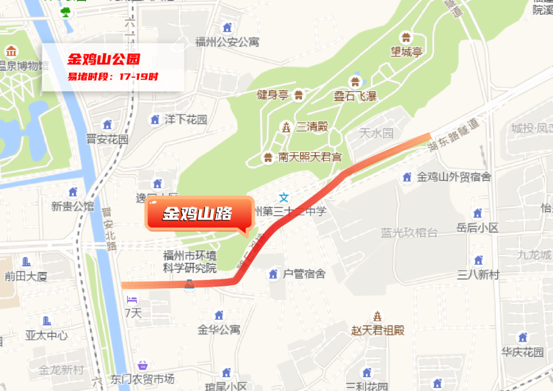 易堵路段为福马路鼓山下院路段,易堵时段为9-11时,高峰通行速度预计为20公里/小时,预计拥堵状态为严重拥堵。