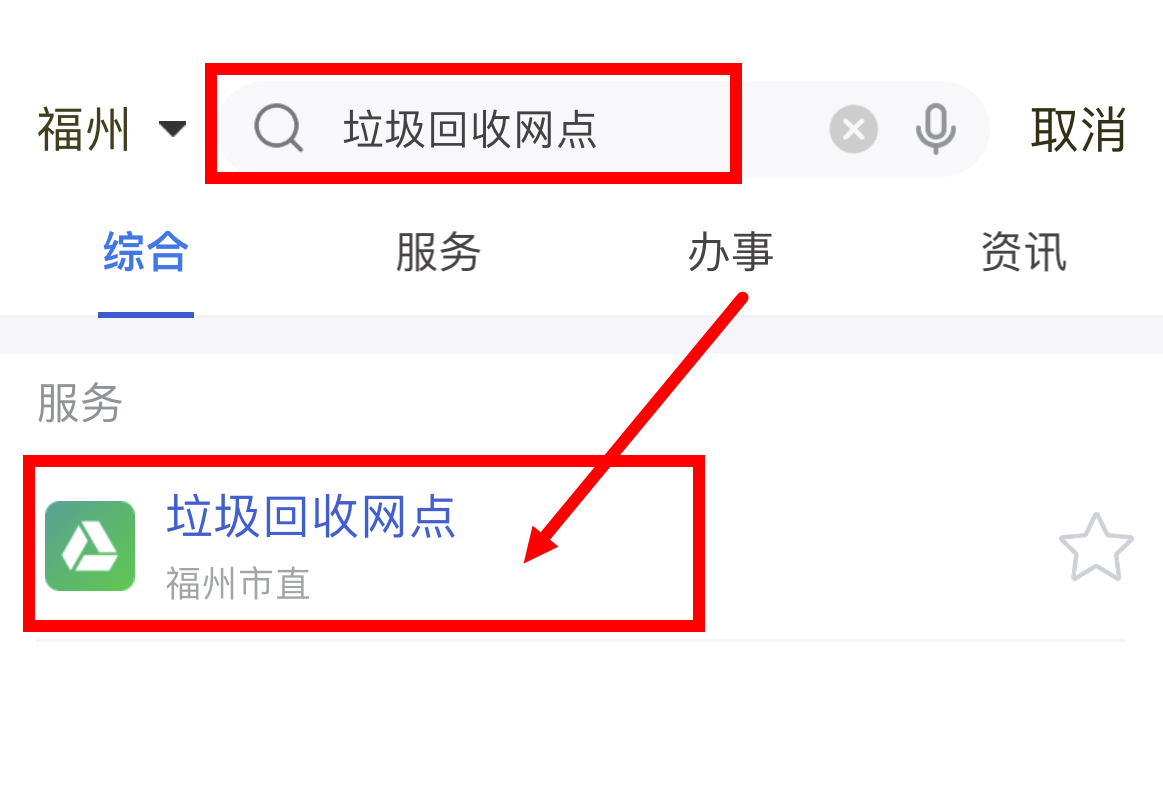 方式一:“闽政通”首页搜索栏输入“垃圾回收网点”,点击即可进入。