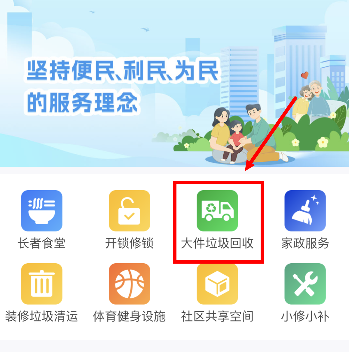 “e福州”首页搜索栏输入“民生服务”,点击【民生服务】—【便民周边服务】—【大件垃圾回收】—【垃圾回收网点】即可。