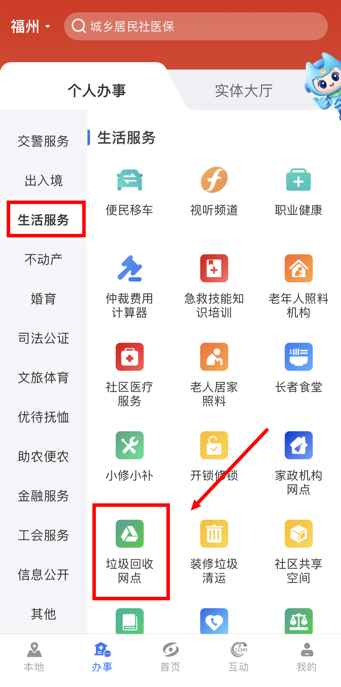 方式二:通过“闽政通”首页点击【本地】,在功能区点击【全部】—【生活服务】—【垃圾回收网点】,即可进入。