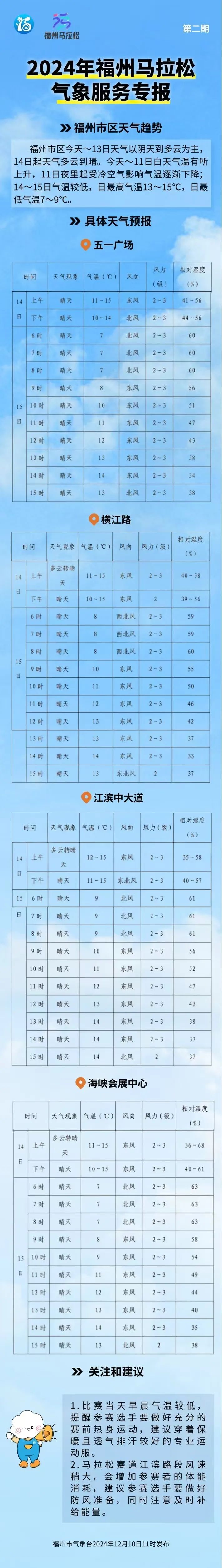 本周末(15日)福州将举办马拉松比赛,目前预测15日福州天气晴,早晨气温较低,仅为个位数,提醒参赛选手要做好充分的赛前热身运动,建议穿着保暖且透气排汗较好的专业运动服。近期大家多留意最新的预报信息,为赛事做好提前的准备。