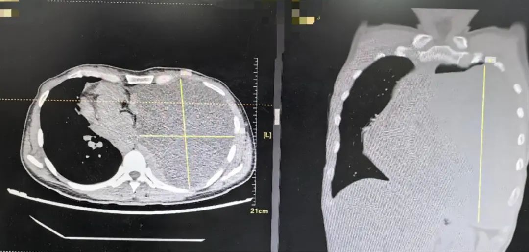 于是,她就诊于福州市第一总医院呼吸与危重症医学科。经肺部CT检查发现:左侧胸腔内巨大占位,几乎占据整个左侧胸腔,心脏气管严重受压移位。