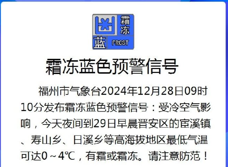 福州市气象台也于2024年12月28日09时10分发布霜冻蓝色预警信号。