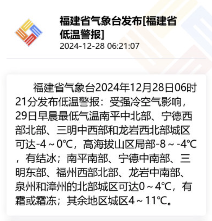 福建省气象台2024年12月28日06时21分发布低温警报。