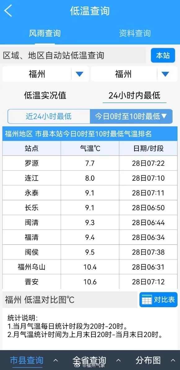 受较强冷空气的影响,加上夜间晴空辐射冷却作用,28日清晨气温低,福州各地最低温在7℃~10℃左右,以福州罗源7.7℃为最低。